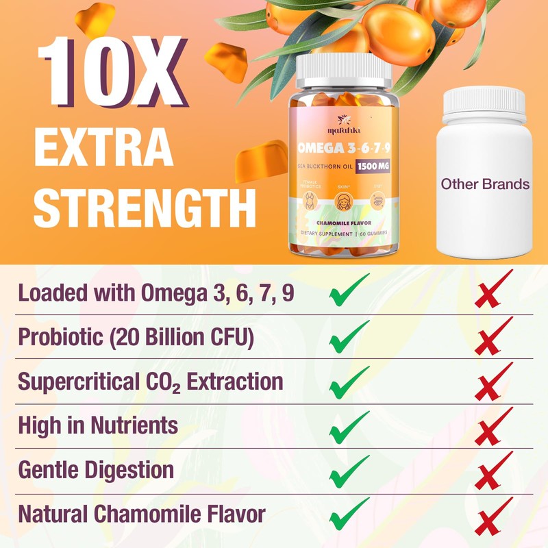 Omega 3 6 7 9 Gummies for Women - Omega 3 Supplement with Sea Buckthorn Oil, Flaxseed Oil, Vitamins E, A & Probiotics - Skin, Eye & Dryness, Chamomile Flavor - 60 Gummies