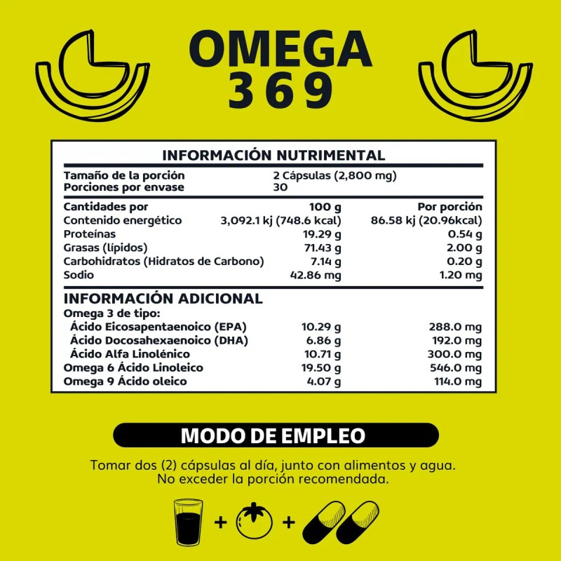 BALANCE ÓPTIMO DE OMEGAS EN UNA SOLA FÓRMULA Omega 3-6-9 Premium Concentrado es un suplemento que combina en proporciones ideales tres tipos fundamentales de ácidos grasos esenciales: Omega-3, Omega-6 y Omega-9. Esta fórmula avanzada ofrece un perfil completo de lípidos saludables, esenciales para complementar una dieta equilibrada. COMPOSICIÓN CLAVE POR PORCIÓN - 480 mg de EPA y DHA (Omega-3): Provenientes de fuentes marinas purificadas, estos ácidos grasos son altamente biodisponibles y reconocidos por su pureza. - 300 mg de Ácido Alfa-Linolénico (ALA - Omega-3): De origen vegetal, ideal para quienes buscan una fuente complementaria de Omega-3. - 546 mg de Omega-6: Equilibrado para mantener una proporción saludable con los demás ácidos grasos. - Omega-9 (ácido oleico): Proveniente de aceites vegetales seleccionados, aporta un perfil graso completo. FÓRMULA PREMIUM Y CONCENTRADA Cada cápsula ha sido desarrollada con aceites purificados y estandarizados para asegurar una alta concentración y calidad.