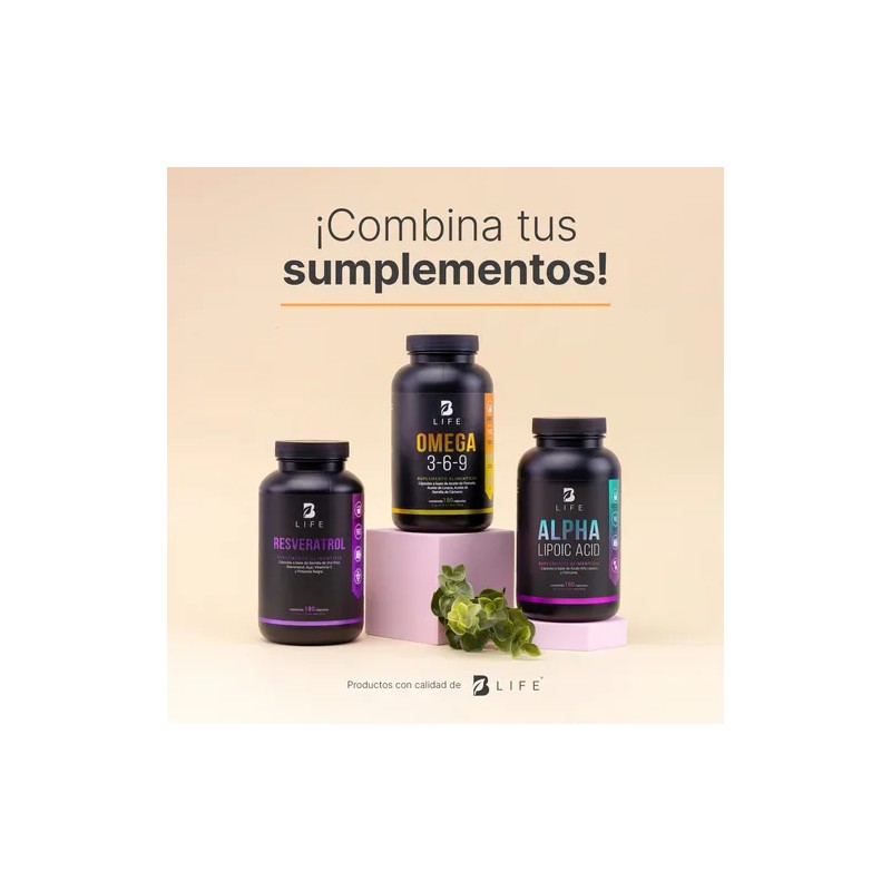 ¡Disfruta la formulación de Omega 3-6-9 B Life! Cada cápsula de 1000 mg está diseñada a base de 400 mg de Aceite de Pescado (EPA y DHA), 300 mg de Aceite de Linaza y 300 mg de Aceite de Semilla de Cártamo, a comparación de otras fórmulas que contienen menor concentración. Complejo de ácidos grasos esenciales para tu bienestar. Contiene 180 cápsulas.