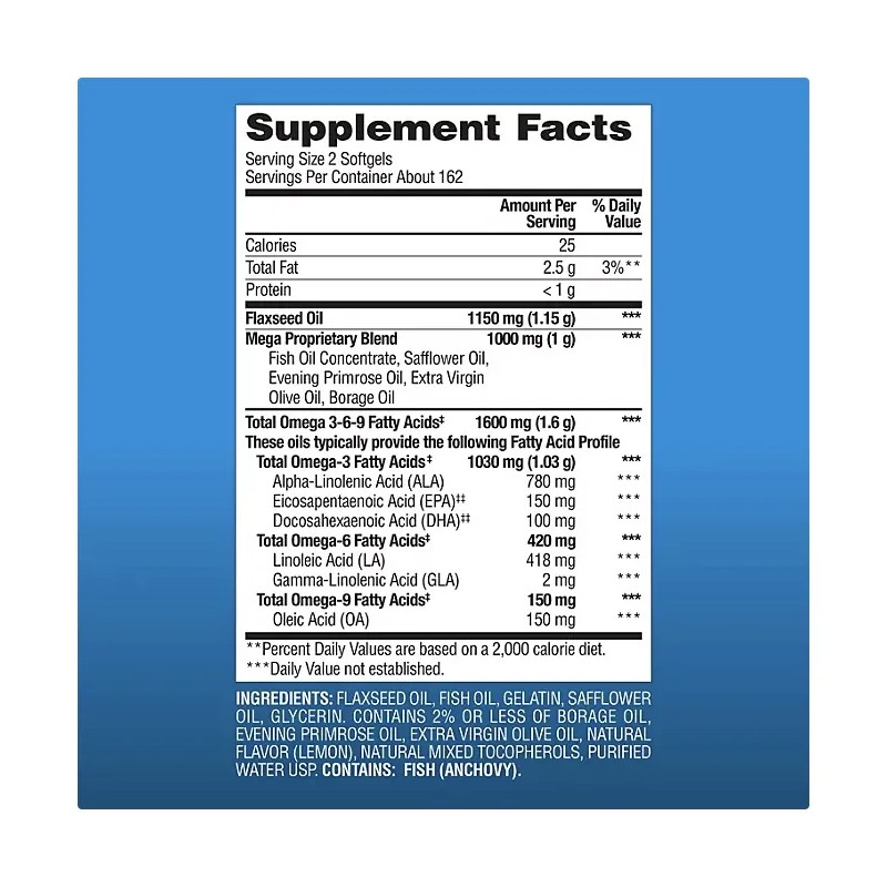 Omega 3‑6‑9 Softgels (325 unidades) es un suplemento integral que combina los ácidos grasos esenciales: