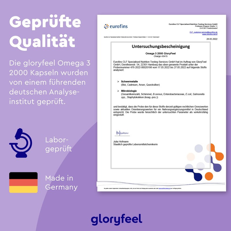 - Made in Germany and independently laboratory tested – manufactured in Germany under the highest quality standards and strictest quality controls, each Gloryfeel product is subject to continuous tests of accredited independent German testing laboratories certified according to DIN EN ISO/IEC 17025. ▶️ Certificate of analysis: see product images. We have our Omega 3 capsules tested for loads such as heavy metals, salmonella and mould.