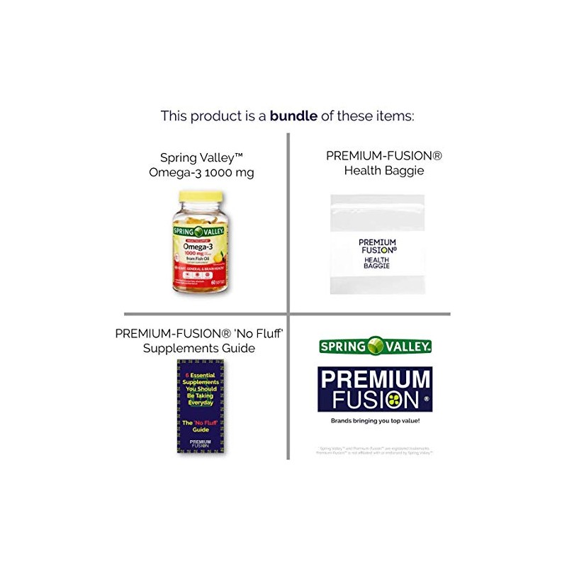 - ✔ Esta es una botella de Omega 3 de aceite de pescado, 1000 mg de Spring Valley + una bolsa de vitaminas y una guía para suplementos de PREMIUM