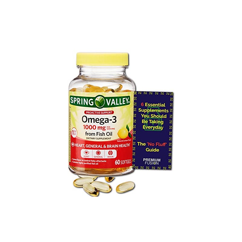 --------------- ✔ Esta es una botella de Omega 3 de aceite de pescado, 1000 mg de Spring Valley + una bolsa de vitaminas y una guía para suplementos de PREMIUM-FUSION --------------- ✔ Sabor natural a limón en cada gel suave para controlar el regusto a los peces. --------------- ✔ Normas internacionales de aceite de pescado calificación de 5 estrellas para pureza, potencia y frescura. --------------- ✔ Fabricado con aceite de pescado altamente purificado (producto de Canadá). --------------- ✔ Preocupación de salud: salud del corazón y del cerebro. --------------- Nuestro Omega-3 de Spring Valley de Fish Oil Proactive Support es un suplemento diario con sabor natural a limón que proporciona una gama de beneficios para tu salud. Dependiendo de tus necesidades, solo un gel suave al día puede ayudar a apoyar el corazón, el cerebro y la salud general.
