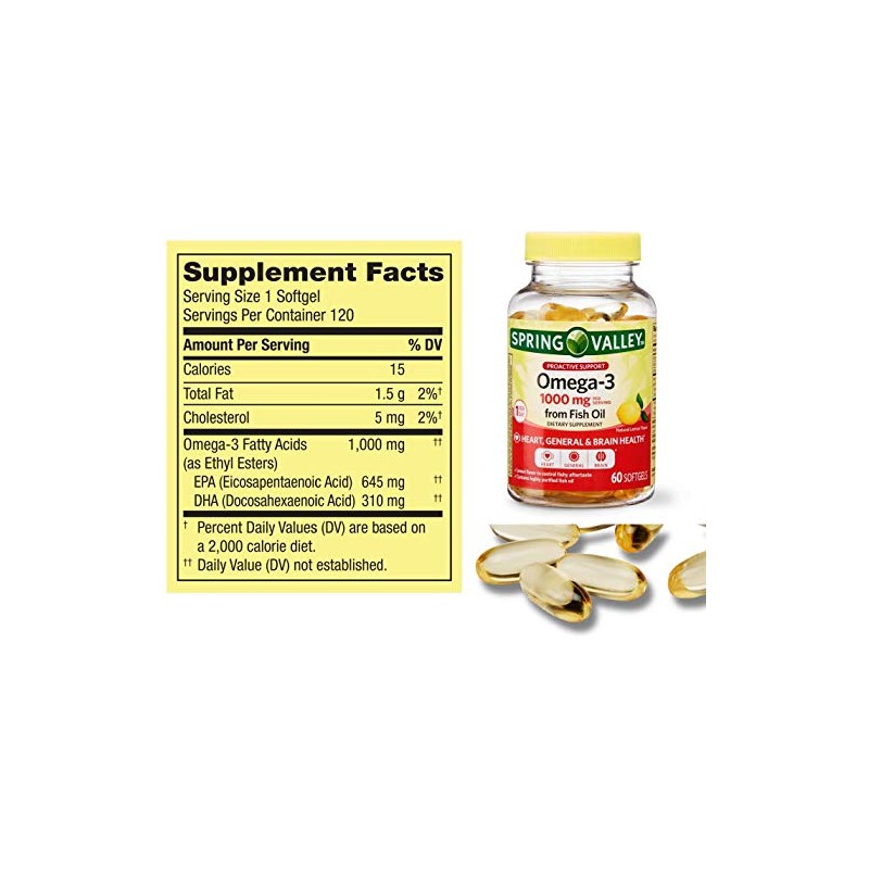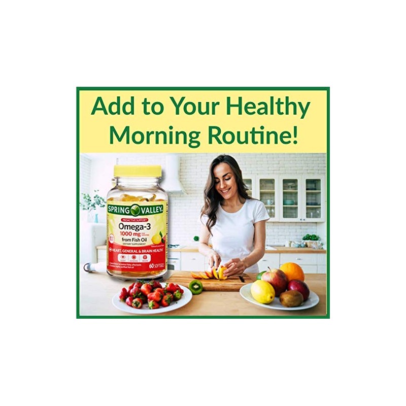- 3 de Spring Valley de Fish Oil Proactive Support es un suplemento diario con sabor natural a limón que proporciona una gama de beneficios para tu salud. Dependiendo de tus necesidades, solo un gel suave al día puede ayudar a apoyar el corazón, el cerebro y la salud general. Los principios activos son ácidos grasos de cadena larga EPA (ácido eicosapentaenoico) y DHA (ácido docosahexaenoico). Estos ácidos grasos son nutrientes importantes que tu cuerpo no puede hacer naturalmente por sí solo. Además, numerosos estudios han encontrado que alrededor del 95 % de los estadounidenses no consumen suficientes ácidos grasos Omega