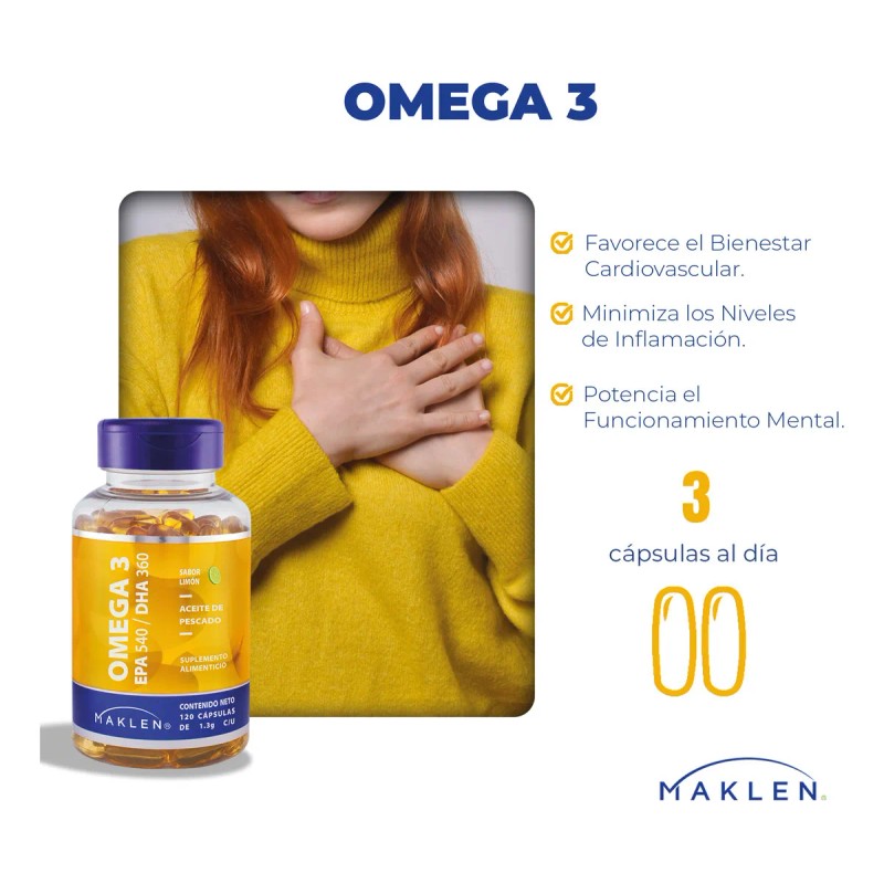 Los Omega 3 son grasas saludables cruciales que el cuerpo no puede producir por sí mismo, por lo que deben obtenerse a través de la dieta o suplementos. Maklen te proporciona una fuente pura y confiable para apoyar las áreas más vitales de tu salud:
