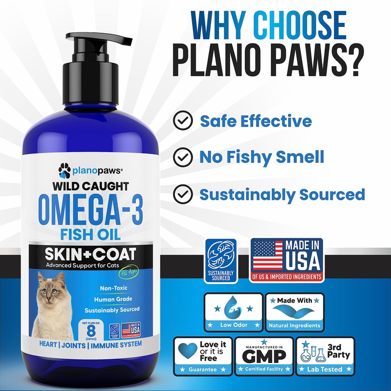 - Reduce Shedding + Improve Skin and Coat - Plano Paws Wild Caught Omega 3 for Cats is made with pure Anchovies, Herring, Mackerel, and Sardines from the clear ocean waters off the coast of Iceland.