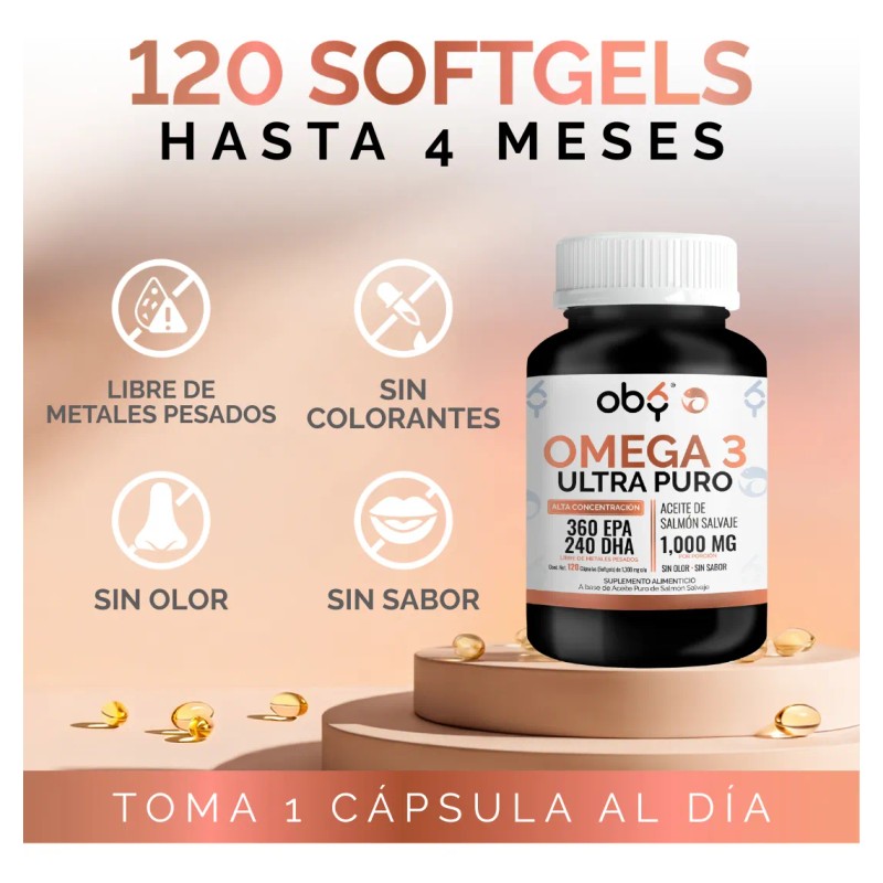 - Omega 3 Premium de Oby con Aceite Puro de Salmón Salvaje : 1000 mg de Aceite Puro de Salmón Salvaje + Ácidos grasos de ALTA CONCENTRACIÓN: DHA + EPA. 120 capsulas con tecnologia en Softgels (sin sabor y sin olor) para 4 meses de consumo. Doble Concentración superior garantizando que recibas la dosis óptima de Omega 3 en cada toma: