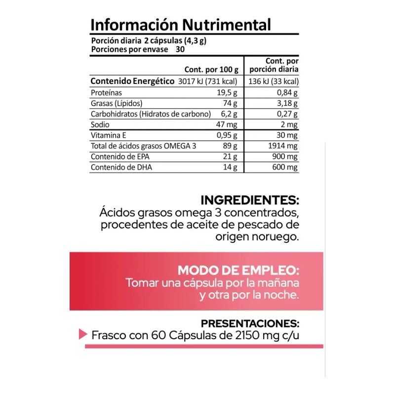 Suplemento alimenticio que contiene 1500mg de EPA+DHA, ácidos grasos Omega 3 concentrados (900 mg de EPA y 600 mg de DHA) y 30 mg de Vitamina E. Se sugiere tomar una cápsula por la mañana y otra por la noche.