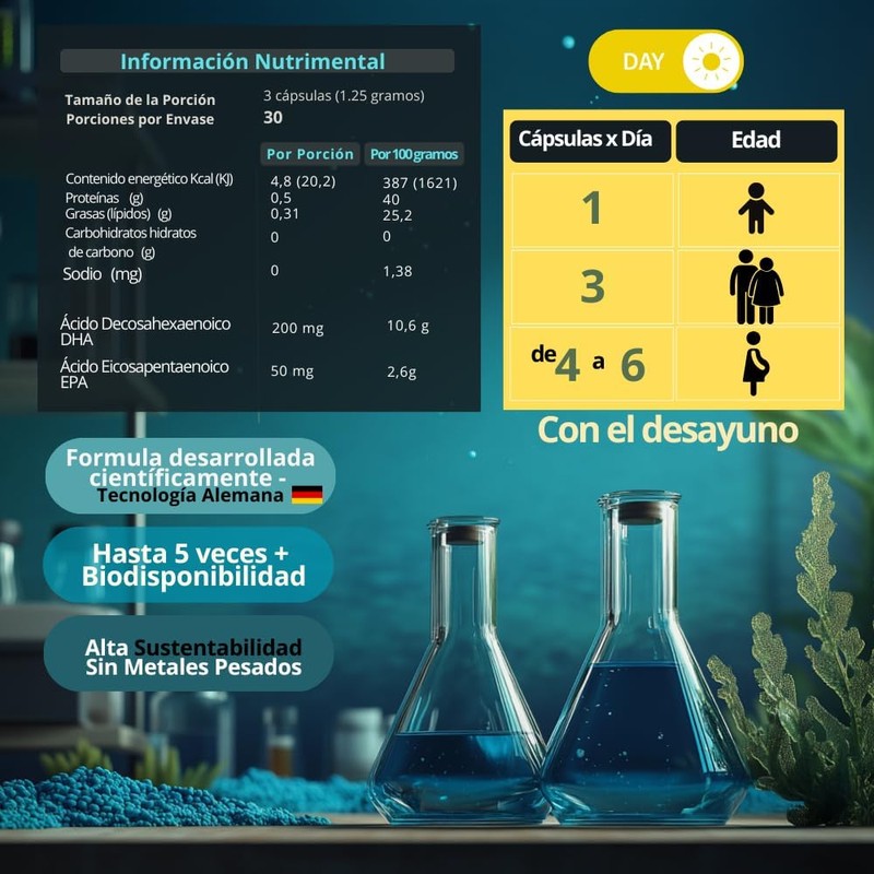 - 🤰 /🤱 / 👶 PREGNANT WOMEN: Algae Omega has a neutral taste and smell, which makes it easier to consume during pregnancy and also for children, in addition to avoiding repeating, it reduces the feeling of nausea and stomach heaviness, without heavy metals, unlike fish oil omega Contents: 30 days DHA: 200 mg EPA: 50 mg CHILDREN: 1 capsule x day ADULTS: 3 capsules x day PREGNANT WOMEN: 3 to 6 capsules x day