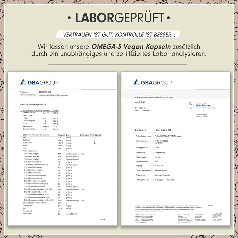 - Laboratory tested and made in Germany: the production of the Omega 3 vegan capsules is exclusively made in Germany. We have the omega-3 capsules regularly examined for all quality parameters and can therefore guarantee a first-class quality of the valuable omega-3 fatty acids. Analysis certificate see 5. Image in the product image gallery.