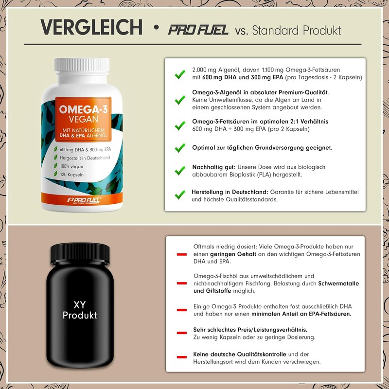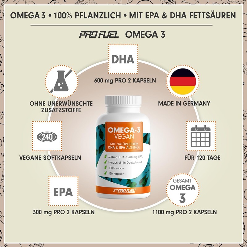 - Omega-3 Vegan: Our Omega-3 capsules contain pure vegetable omega-3 made from high-quality algae oil. It is rich in the special omega-3 fatty acids DHA (docosahexaenoic acid) and EPA (eicosapentaenoic acid).