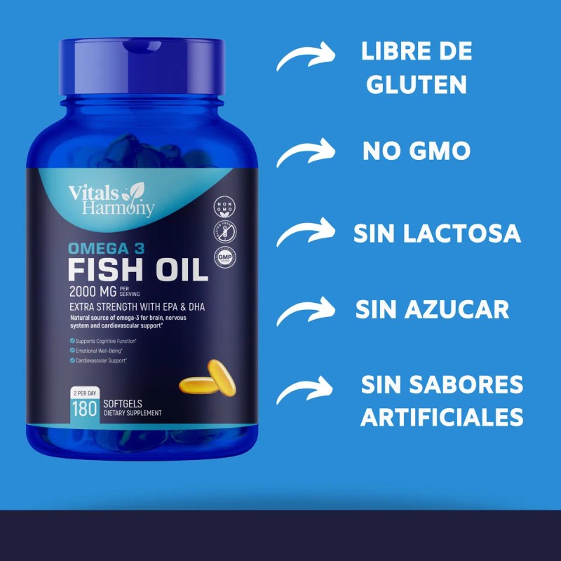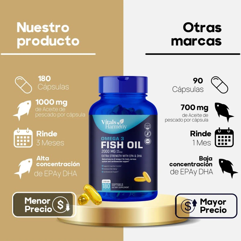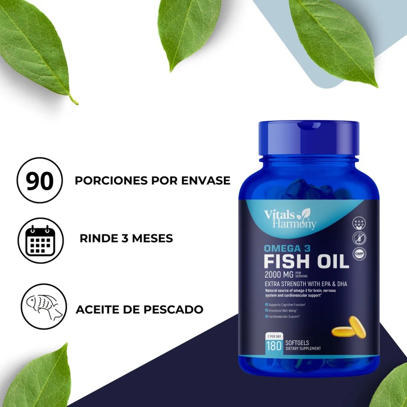 Omega 3 Vitals Harmony – 180 cápsulas de aceite de pescado es un suplemento de alta eficacia diseñado para potenciar tu bienestar diario. Cada frasco brinda un suministro de 3 meses con cápsulas blandas fáciles de consumir. Su fórmula concentrada aporta EPA y DHA esenciales para múltiples funciones del organismo.