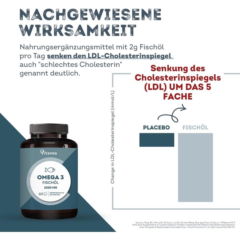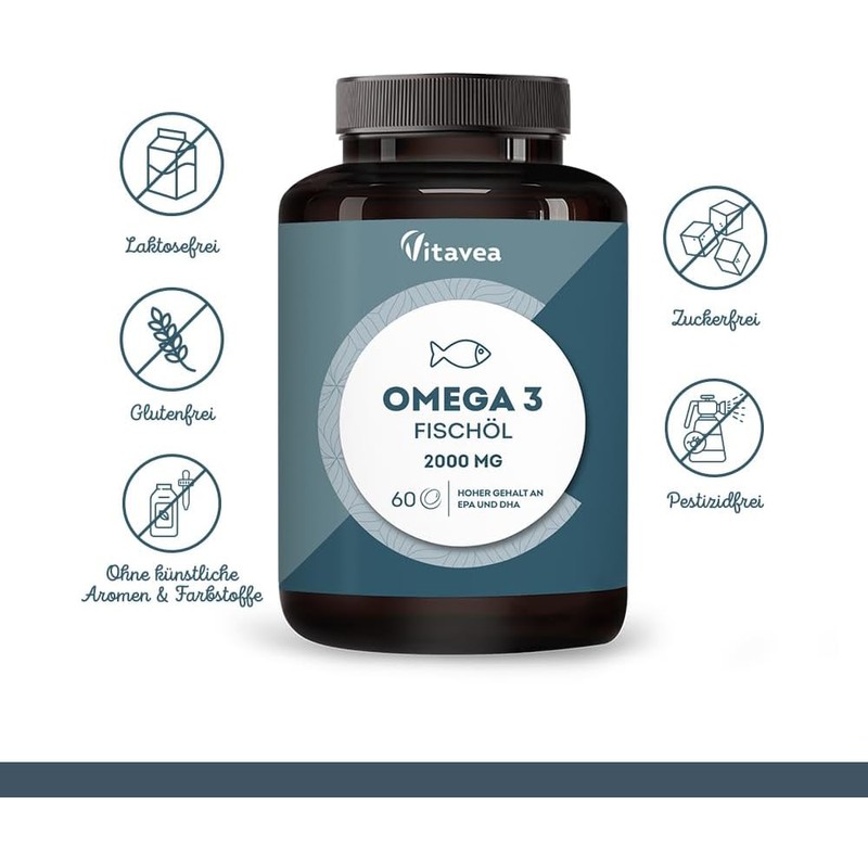 - High dose Omega 3 capsules: Our Omega 3 Vitavea dietary supplement promotes normal heart function and cognitive skills thanks to its high content of EPA and DHA. Each daily dose of this high-dose Omega 3 dietary supplement contains 2000 mg of fish oil and provides an excellent source of antioxidants. A real treatment for good heart function and well-being in everyday life.