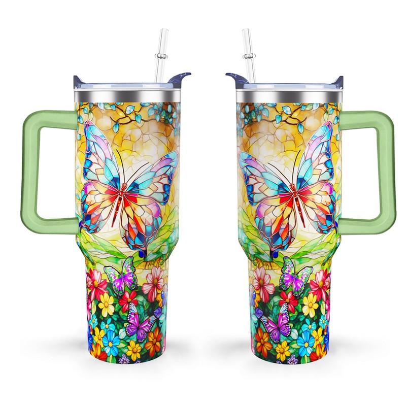 - Perfect for On-The-Go: Insulated butterfly tumbler with handles bottom half of butterfly cups is tapered to perfectly fit in your car's cup holder, making 40 ounce tumbler with handle the perfect tall coffee mugs with handle. The large-capacity 40oz tumbler with handle and straw fits most car cup holders, coffee travel mug with handle allowing you to keep your favorite beverages at hand anytime, anywhere.