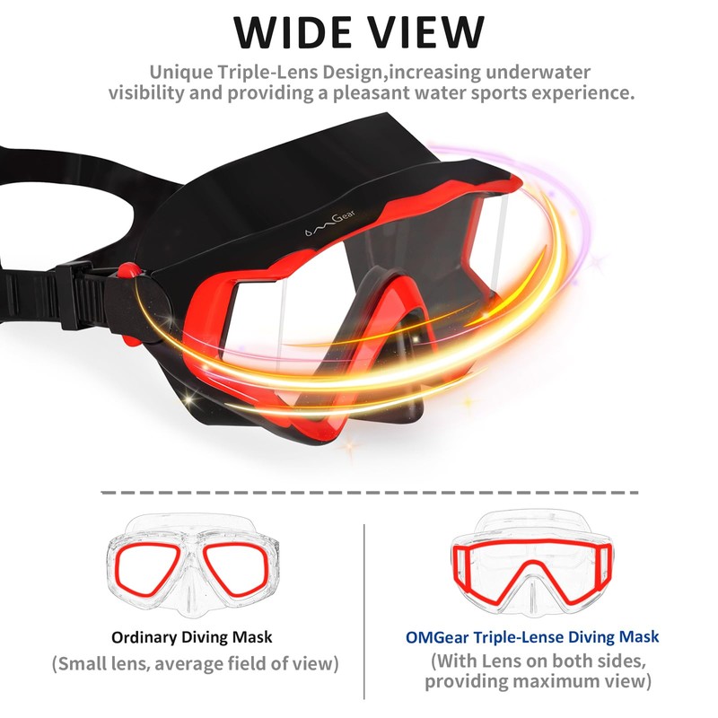 - 【Premium PC Triple-Lens with Anti-fog Coating】OMGear three lens diving mask is made by premium Polycarbonate with anti-fog coating,providing a panoramic field of vision and clear view. This Swim goggles with nose cover is also Shatter-proof and anti-leak,is perfect for users who do not know how to stop breathing by nose when swimming, snorkeling or scuba diving.