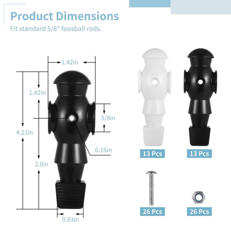- Complete Set: Includes 26 foosball players,13 black and 13 white; each player stands 4.21" tall with a 0.16" back round hole diameter and 5/8" hole diameter, fitting standard 5/8" foosball rods; please check the sizes before purchasing