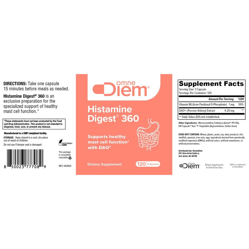Omne Diem Histamine Digest 360 - DAO Enzyme - Diamine Oxidase & Vitamin B6 for P5P - 120 DR Capsules
