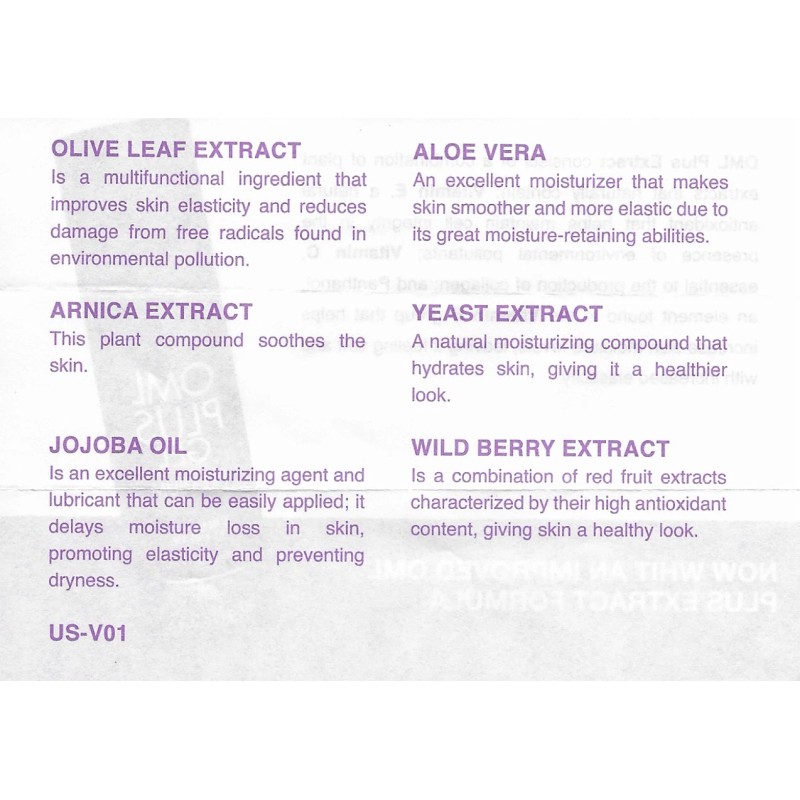OML Plus extract contains a combination of plant extracts that have natural antioxidant properties, support collagen production and help increase collagen. Natural Extracts like: Yeast, Olive Leaf, Arnica and Wild Berries, in addition to Jojoba Oil