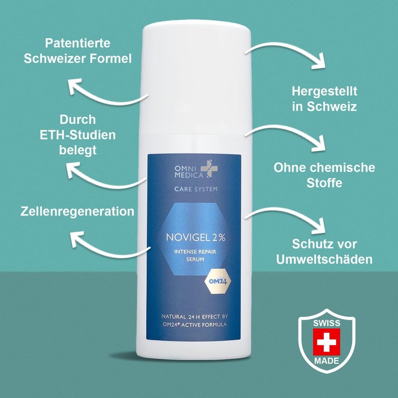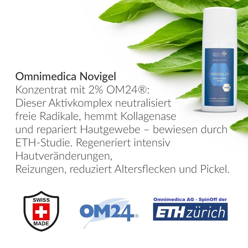 - Swiss made and proven by an ETH studies: Swiss made OM24 products are sold in pharmacies and are also used by a Swiss football club represented in the Champions League. In addition, the Omnimedica Group is sponsor of the football club 1860 Munich. Novigel with a 2% OM24 active ingredient neutralises free radicals, inhibits collagenase and repairs skin tissue. The cream intensively regenerates skin changes and irritations, reduces age spots and pimples