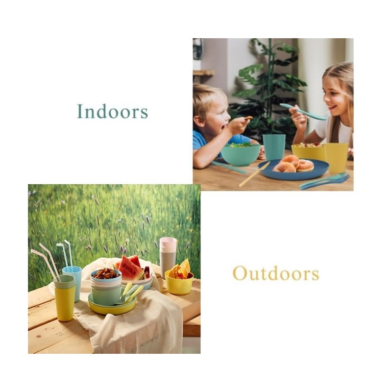 OMNIRA Wheat Straw Dinnerware Set is a lightweight, unbreakable dinnerware set designed for families, toddlers, and outdoor enthusiasts. This plate and bowl set includes kids plates and bowls sets, cups and utensils, making it perfect for home, camping, and RV trips. Made from non-toxic wheat straw plates and bowls sets, this microwave safe plates and bowls set is BPA-free, durable, and eco-friendly. The toddler plates and bowls set is designed for small hands, ensuring a safe and fun dining experience. Whether you need a camping kitchen set, RV dishes, or picnic dishes, this non-breakable dinnerware is ideal for both indoor and outdoor use. The kids dishes dinnerware sets are easy to clean, dishwasher safe, and come in a colorful design, making mealtime enjoyable for kids and adults alike.