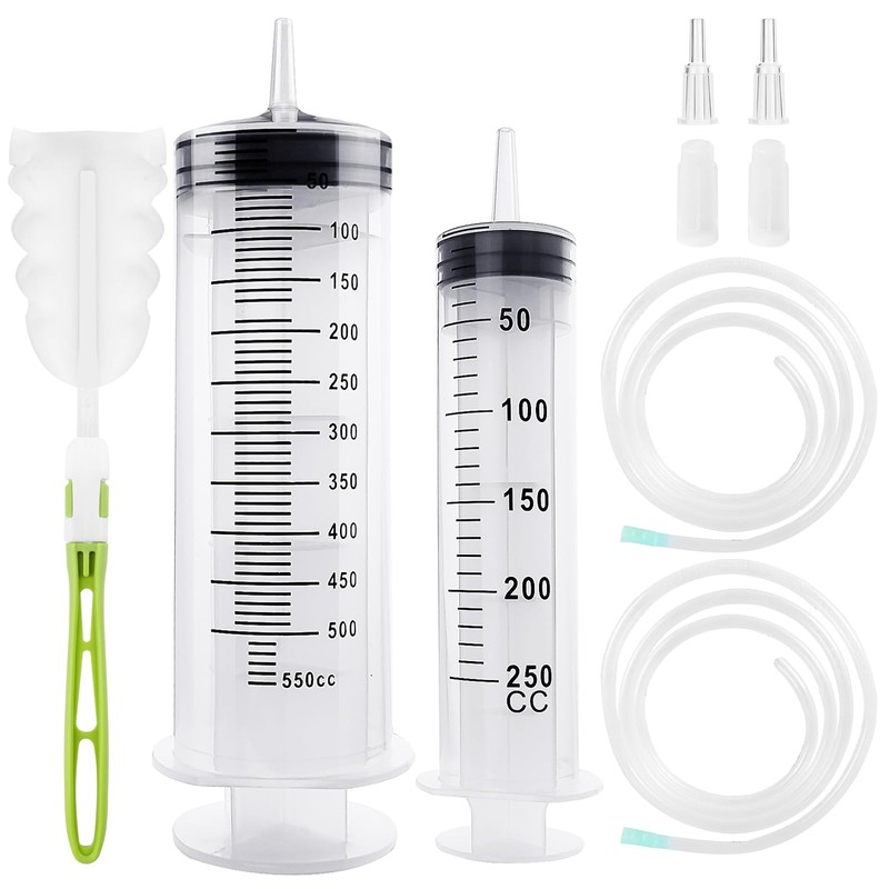 - 2 Syringe Set : You can obtain 2 syringes, 250 milliliters and 550 milliliters, 1 cleaning brush, and 1 hose with a diameter of 5 millimeters and a length of 1 meter, all individually sealed and packaged to ensure product safety and hygiene.