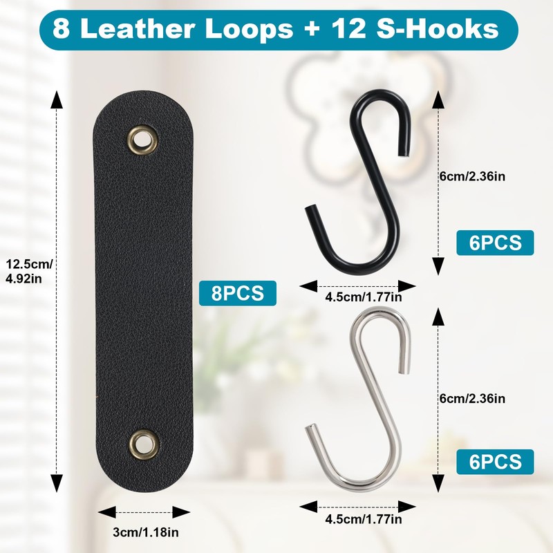 VERSATILE COMBINATION TO MEET DIFFERENT NEEDS It includes 8 leather loop, 6 S hooks black and 6 silver stainless steel S hooks, which are suitable for different hanging needs.