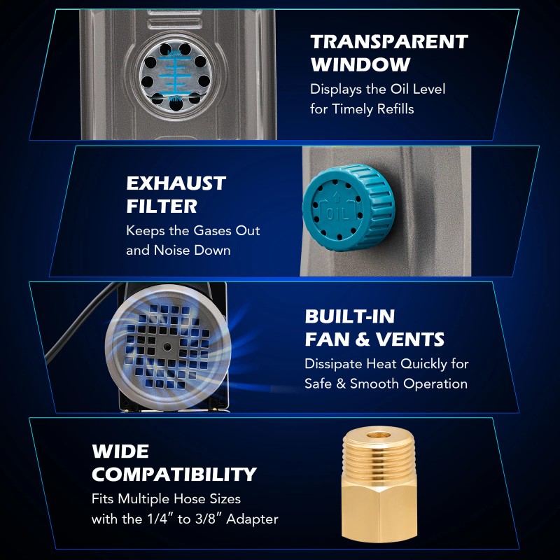- User-Friendly Designs: Our 3.5 cfm pump can draw your system down as low as 37.5 microns (5 Pa). Its innovative design prevents oil backflow and overheating for safe operation. The 7.6 fl. oz. reservoir includes a sight glass and a scale for easy monitoring of the oil level and its quality.