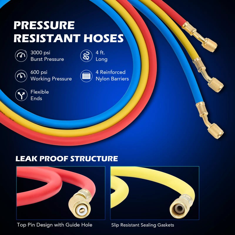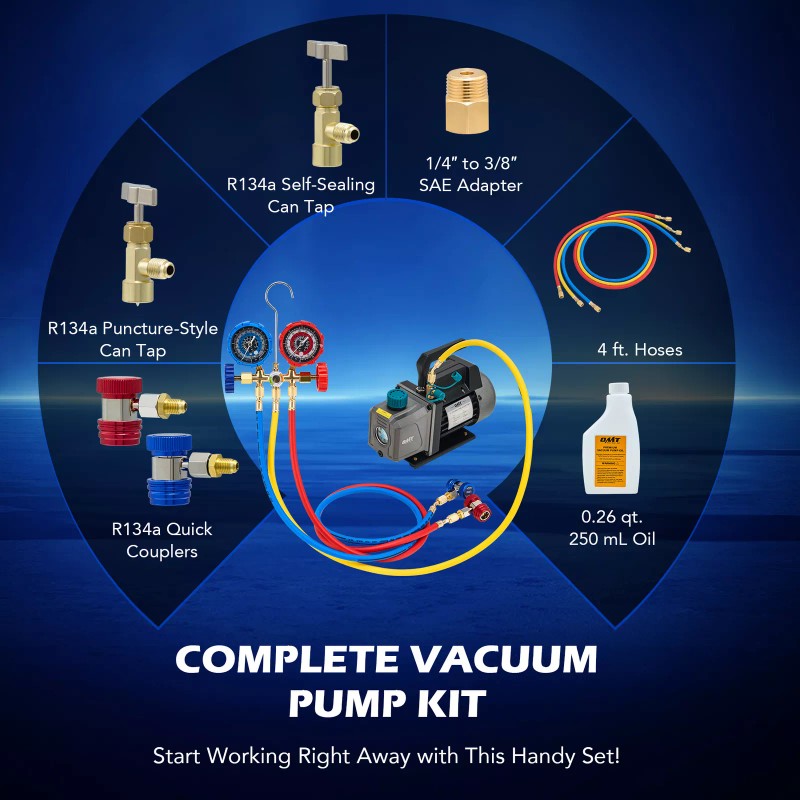 - Complete HVAC Kit: This professional automotive air conditioner tool set includes a powerful 1/4 hp vacuum pump, a manifold gauge set, 3 hoses, a 1/4" to 3/8" adapter, a 1/4" to 1/2" adapter, R134a can taps, an 8.5 fl. oz. oil, and other accessories needed for easy refrigerant evacuation, recharging, and more!
