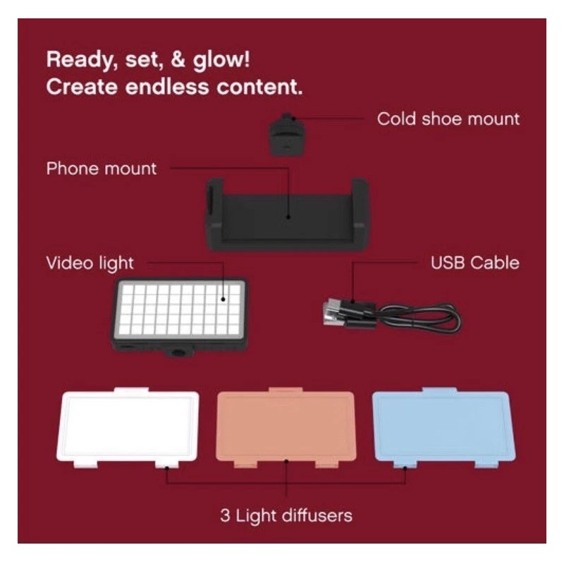 Get the perfect glow in any setting with the On Air™ Video Light! This smartphone LED light and mount helps you keep up with your social media needs, letting you record or go live from your smartphone. The high-powered LED bulbs and diffuser plates help you find the perfect light for photos, videos, podcasts, and more.