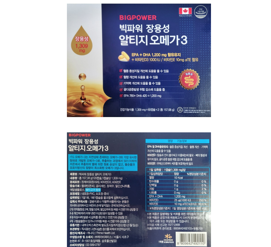 [On Sale] Big Power Enteric-soluble RTIZomega 3 120 capsules, 4-month supply / [온세일]빅파워 장용성 알티지오메가3 120캡슐 4개월분
