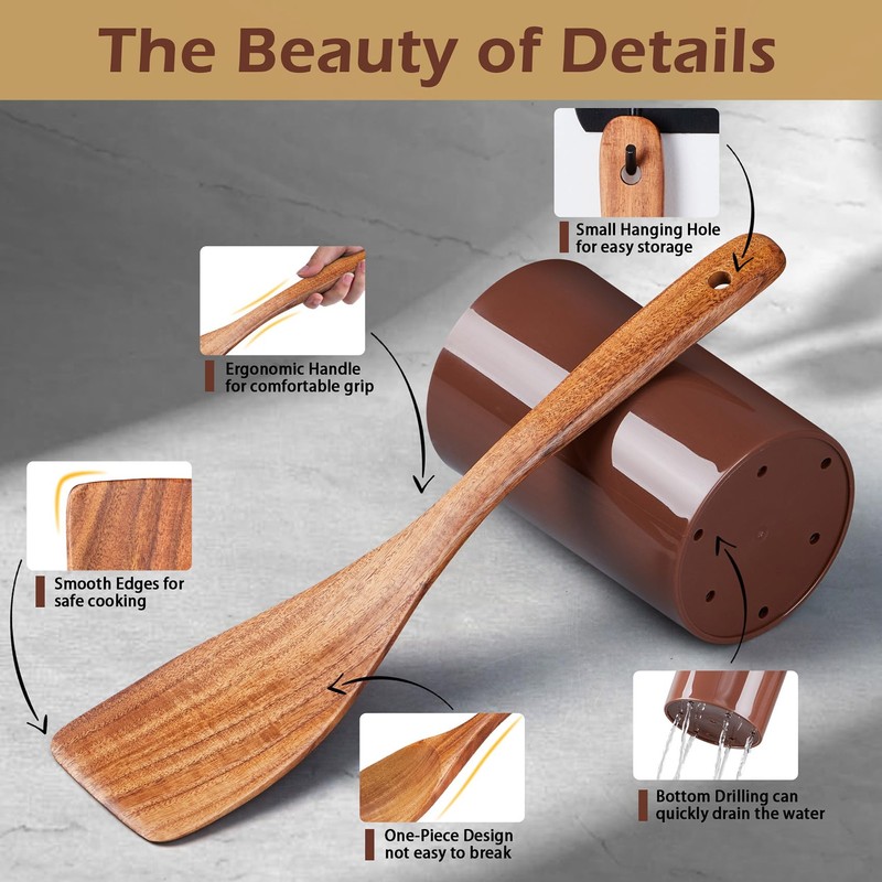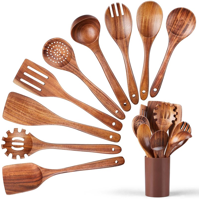 - Heat & Water Resistant: Solid wood head withstands high heat to 212℉/100℃ without melting or chipping, Excellent heat insulation for anti-scalding while cooking, Teak wood with water resistant is not easy to get damp for long-lasting, Each utensil has unique texture and color, bringing elegance and classic to your kitchen or farmhouse