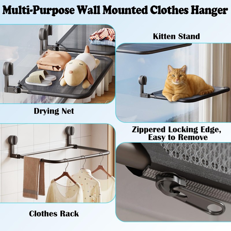 - SMART HOME UPGRADE: FASTER DRYING + MODERN AESTHETICS:Boost functionality and style!The open-grid structure accelerates drying by 30% vs.cramped racks, using UV sunlight and 360°airflow for fresher,odor-free results.Its sleek fold-flat profile blends seamlessly into modern bathrooms,balconies,or RVs.No more clunky freestanding racks – this space-savvy laundry hanger wall mount is the elegant,practical upgrade your home deserves