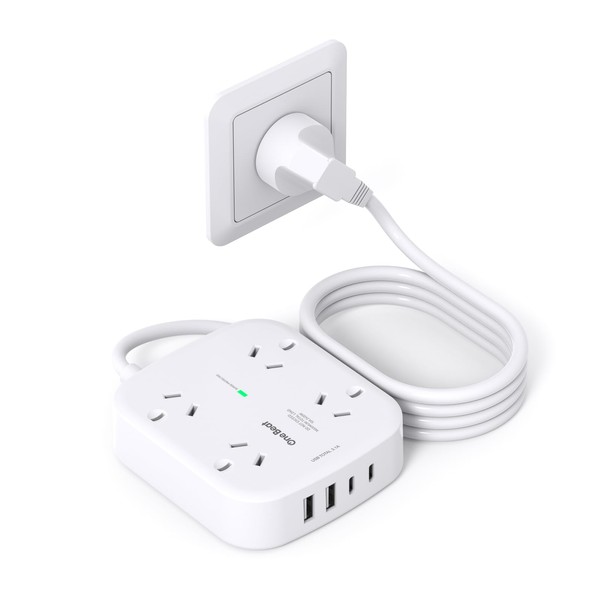 One Beat Surge Protected Power Board with 4 AC Outlets & 4 USB Ports (2×USB-C), 1.5M Extension Cord, AU Standard Travel Power Strip for Office, Dorm, Home Essentials