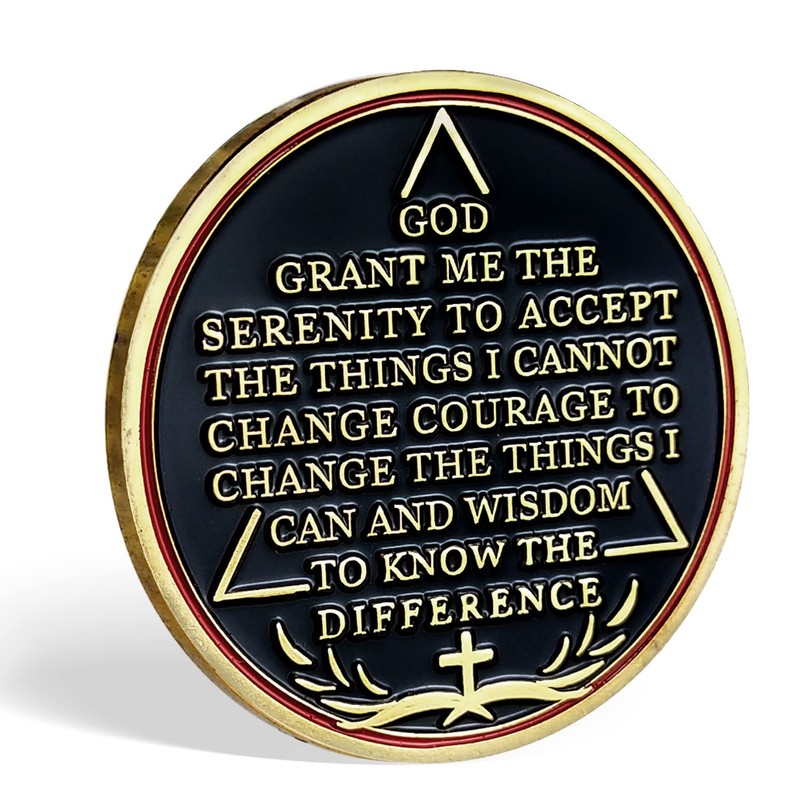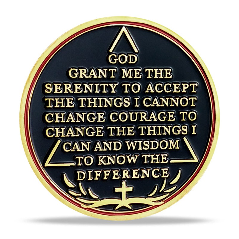 Reverse side of sobriety chip says Serenity Prayer: God grant me the serenity to accept the things I cannot change courage to change the things I can and wisdom to know the difference. It mean that learn to accept things , don't worry the future and take one day at a time.