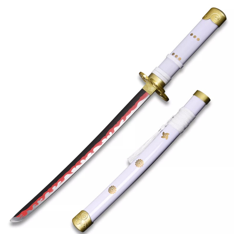 The sword One Piece Roronoa Zoro Ame no Habakiri features in the famous anime One Piece. It belongs to Roronoa Zoro's and he describes it as a magnificent sword. This O Wazamono grade Katana once belonged to Zoro's childhood female counterpart, Kuina and her family.  When Kuina unexpectedly passed, Zoro asked Kuina's father if he might inherit the Wado Ichimonji in honor of Kuina. The sword features a stainless steel dual tone blade. The scabbard is all white with PU leather wrap. The handle is also white PU leather wrapped. The guard is a solid piece of metal.