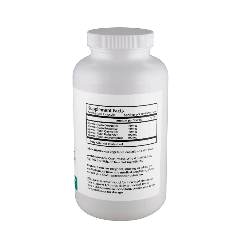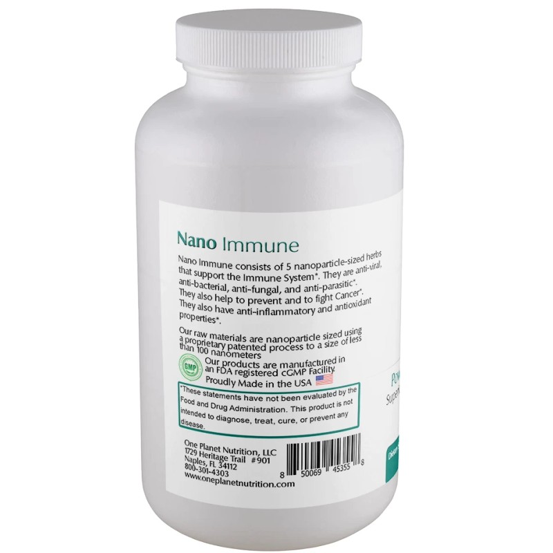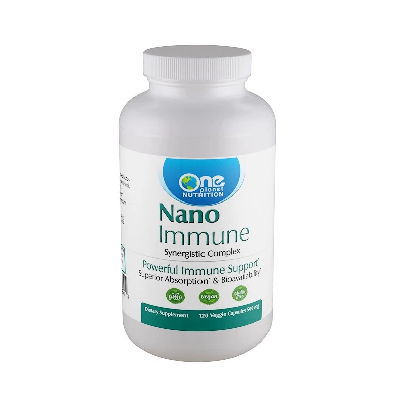 One Planet Nutrition Nano Immune delivers 500 mg per capsule of a precise blend of five nanoparticle-sized botanical extracts: Nano Curcumin (Curcuma longa), Nano Boswellia (Boswellia serrata), Nano Quercetin, Nano Berberine (Berberis aristata), and Nano Andrographis (Andrographis paniculata). These plant-based compounds are rich in polyphenols, terpenoids, and other active constituents that have been widely studied for their effects on immune function, cellular signaling, and antioxidant defense. Together, they help support a balanced immune response and promote overall cellular resilience.