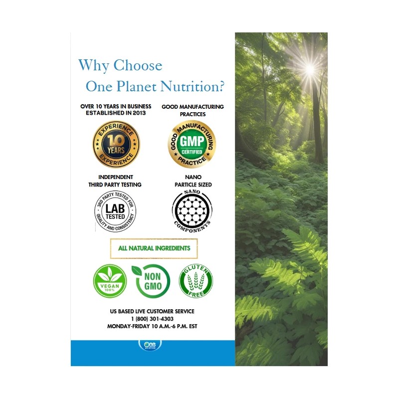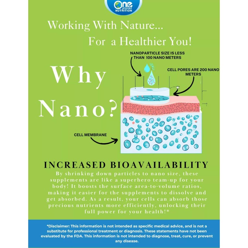 One Planet Nutrition specializes in nanoparticle herbal supplements designed for maximum cellular absorption. Our proprietary patented process reduces botanical extracts to less than 100 nanometers in size, improving uptake and effectiveness. All products are manufactured in the U.S. under strict quality standards and undergo third-party testing for purity and safety.