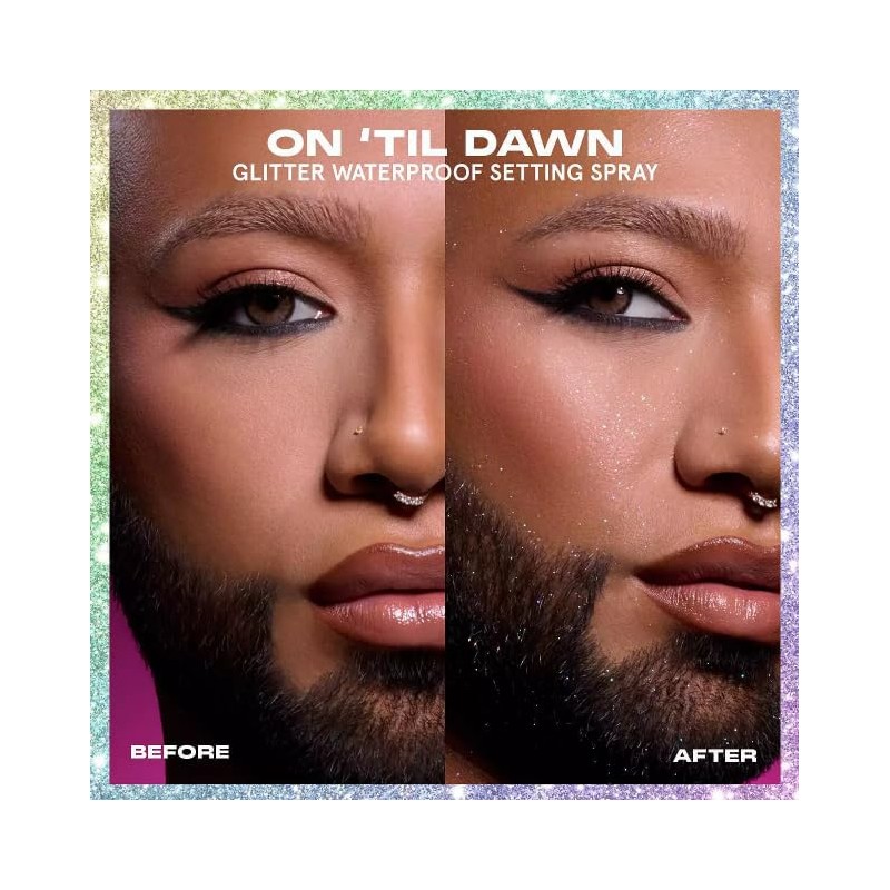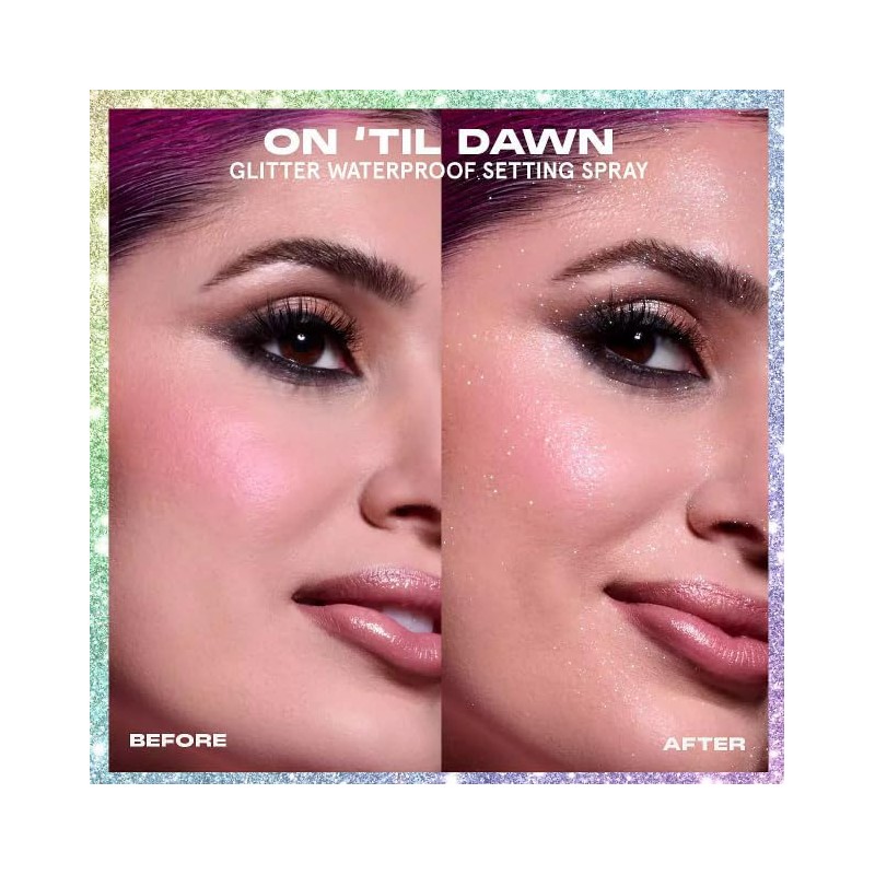 One Size On 'Til Dawn Glitter Waterproof Setting Spray 3.4 oz / 143 mL Limited Edition. Iridescent Glitter Blend: Creates a wash of rainbow shimmer.