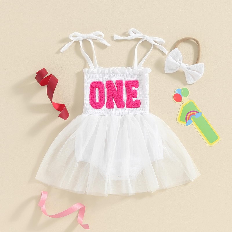 One Year Old Girl Birthday Outfit Tie Shoulder Smocked Romper + Bow Headband ...