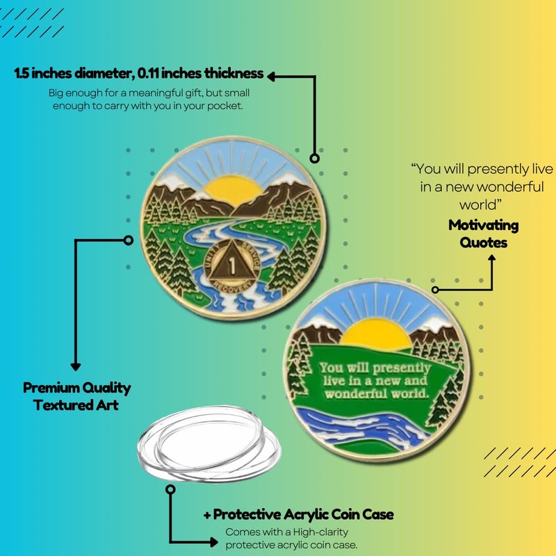 The "Wonderful World" Sobriety Coin is a stunning celebration of your first year of sobriety, symbolizing the beauty and renewal that comes with a life in recovery. This gold-plated medallion features intricate designs of rivers, lush greenery, mountains, and trees, all brought to life with the vibrant colors of nature. Each detail reflects the serenity and strength found in the natural world, serving as a powerful reminder of the peace and growth you've achieved on your journey. This one-year sober coin is a meaningful token, perfect for commemorating this significant milestone and inspiring continued progress. Whether for yourself or as a gift for a loved one, the "Wonderful World" coin is a beautiful representation of the new life and wonderful world you've embraced. Measuring 1.5 inches in diameter, 3mm thick, and weighing 1oz, this coin is both a substantial and meaningful token that will stand the test of time.