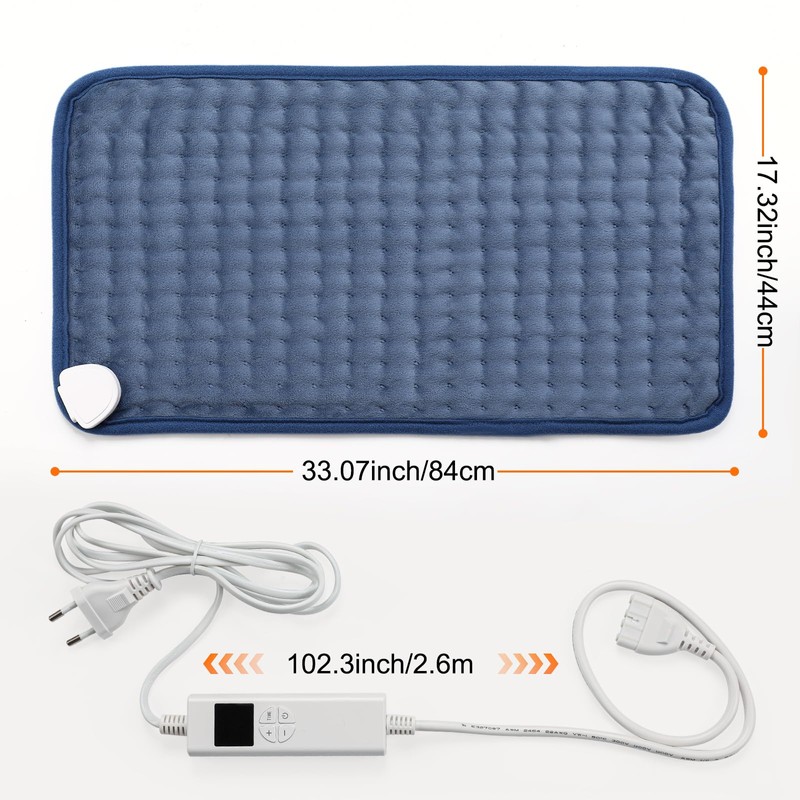 Large size electric heating pad, effectively relieves aches and pains in different parts of the body, promotes blood circulation, relieves fatigue, can be used at home, office Safety Information: 1. Please wash it at a water temperature of 30⁰C. 2. DO NOT dry or iron the heating pad dry. 3. Never put the pad in the tumble dryer. 4. DO NOT fold the heating pad when it is in operation. 5. Make sure that the product and the plug are completely dry before connecting the device. 6. DO NOT let other objects cover the heating pad during use.