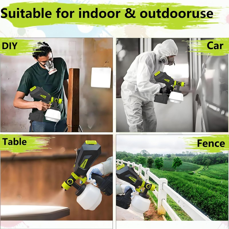 - Wide Applications:Experience the freedom of cordless convenience with the ONEFINSH Paint Sprayer, allowing you to tackle projects without constraints or tangled cords., this portable spray paint gun is a convenient alternative to traditional corded paint sprayers, brushes, or rollers. It's great for smaller projects like DIY toys, doors, windows, fences, chairs, benches, desks, cabinets, coops, pet houses, and more, especially with water-based paint. It also work well with stains or varnishes