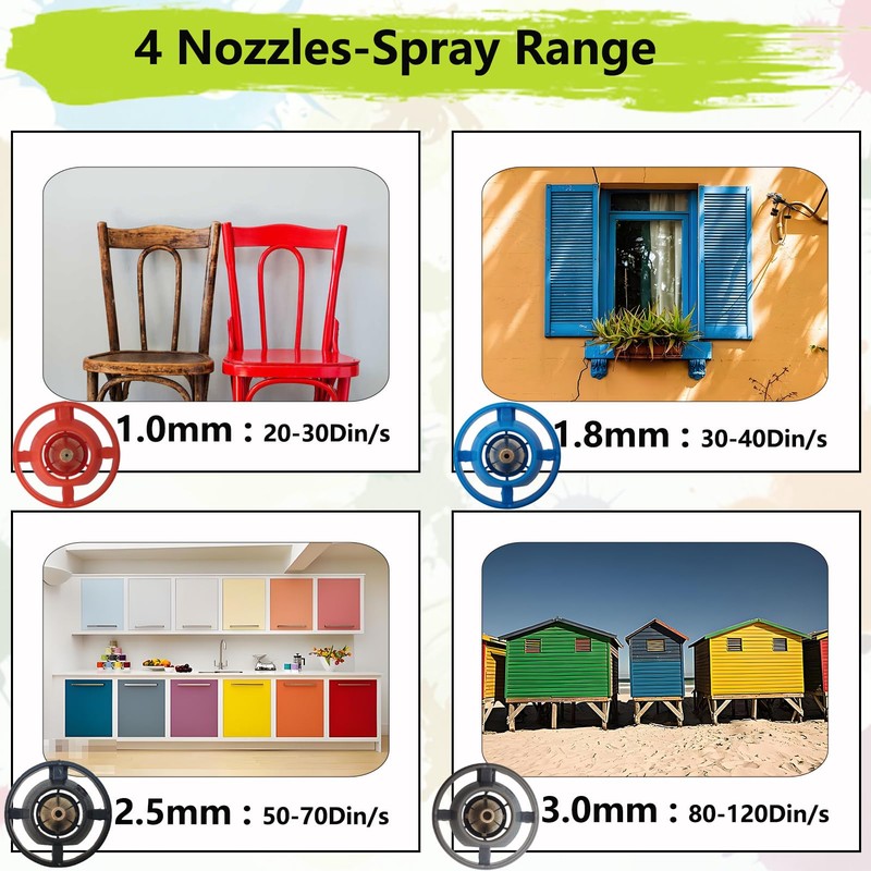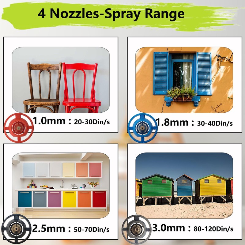 - 3 Patterns & 4 Size Nozzles: This paint spray gun kit includes 4 copper nozzles in sizes 1.0mm, 1.8mm, 2.5mm, and 3.0mm, each designed for different paint flow rates, offering versatility for various projects: the 1.0mm nozzle for DIY toys, 1.8mm for chairs, 2.5mm for cabinets and doors, and 3.0mm for fences, pet houses. The paint sprayer also features three adjustable spray patterns – vertical, horizontal, and circular – ensuring efficient and easy completion of your home painting projects
