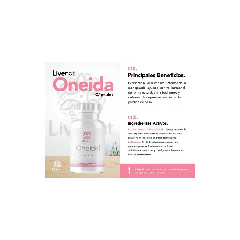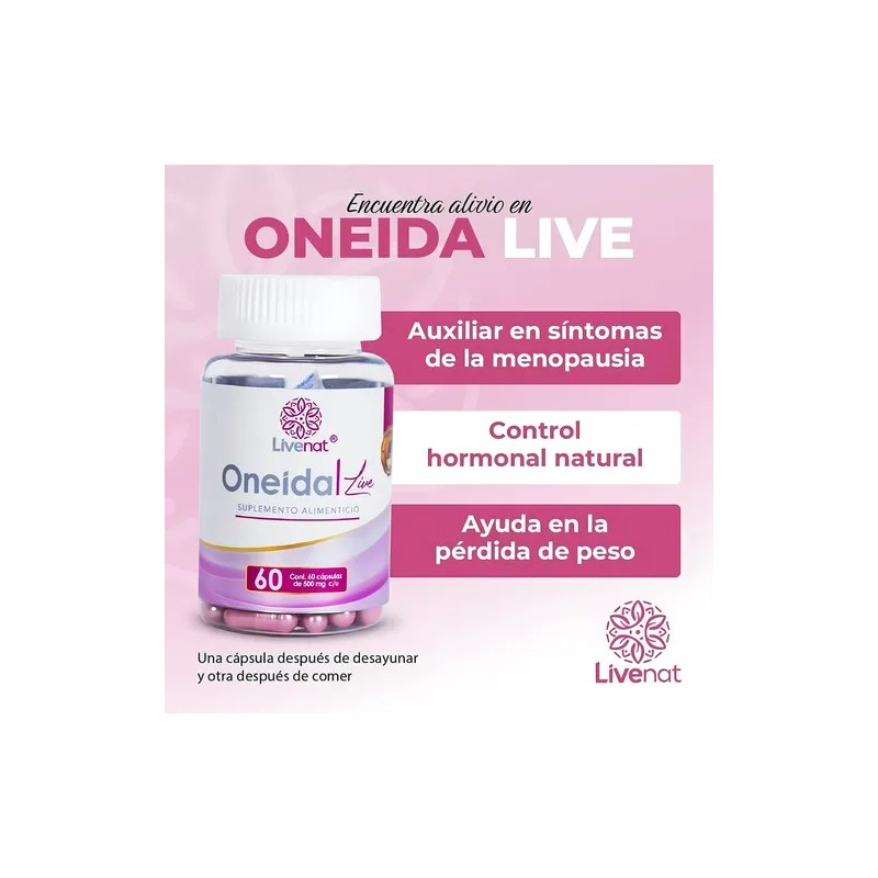 Oneida de Livenat es un suplemento nutricional en cápsulas formulado para apoyar el control hormonal femenino y ayudar a manejar el peso durante la menopausia o cambios hormonales. Contiene isoflavonas y otros ingredientes naturales (ver detalle en envase) que contribuyen a mejorar el bienestar integral, disminuir síntomas como sofocos, cambios de ánimo y alteraciones en el metabolismo.