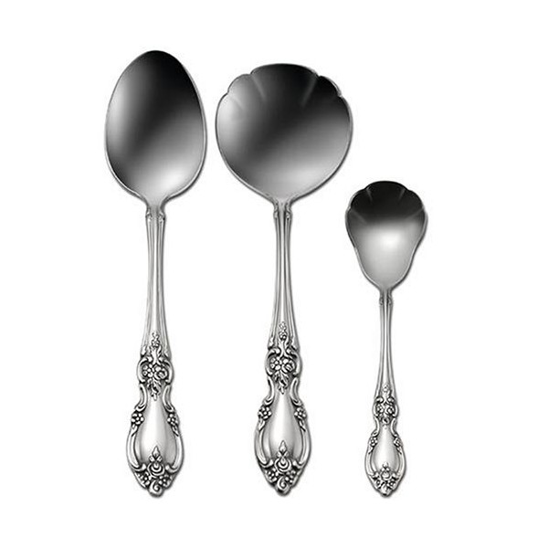 Bold floral details highlighting a fiddleback shape give Louisiana a nostalgic appeal and a southern charm. Great for family dining or entertaining, combining durability with a lustrous finish. Oneida, the leading name in flatware, has been setting tables for generations. Oneida's highest quality stainless flatware, the 3-piece hostess set includes: large serving spoon, gravy ladle and sugar spoon.