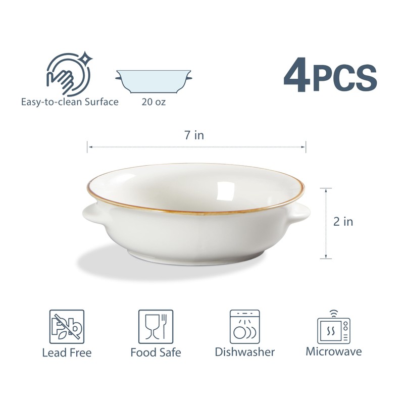 ONEMORE French Onion Soup Bowls Set of 4, 20oz - Microwave, Oven & Dishwasher Safe Round Serving Wide Kitchen Bowls with handles - Scratch-resistant - Cream White