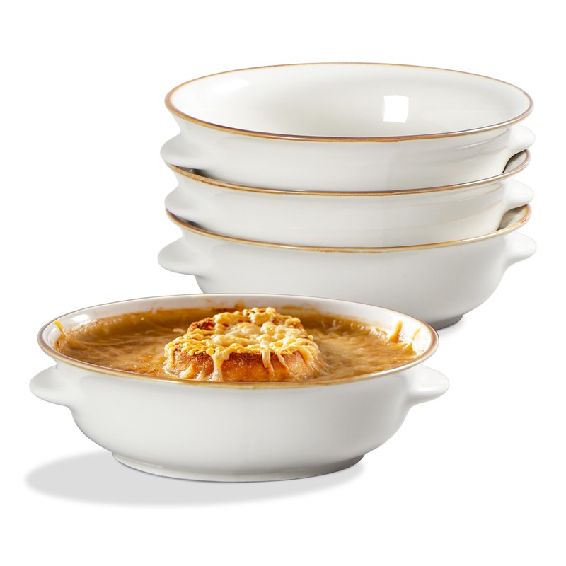 - Small casserole dishes for oven, french onion soup & beyond: These porcelain low bowls with handles are just the right size and shape for eating breakfast, oatmeal, ice-cream, steamy stews, and everything in between