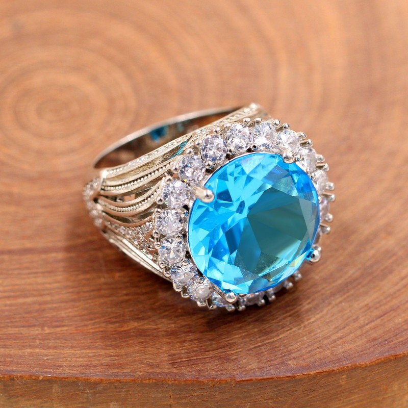 This synthetic light color sapphire ring is themed around fashion and incorporates design elements of eternity shiny dazzling cubic zirconia, symbolizing the eternal and unchanging love and friendship.