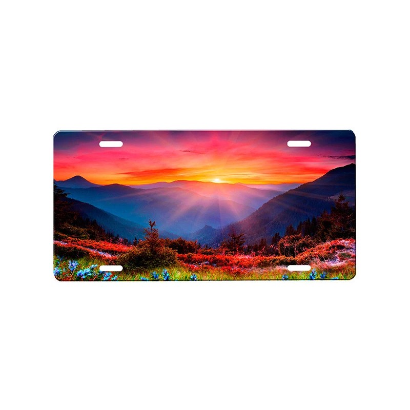 The "Mountain Scene" license plate is made of aluminum with a high gloss surface finish, measuring 12 inches in length and 6 inches in height. It is suitable for cars and can be personalized with a name and font style of choice. The design features a mountain theme and is manufactured by Onestopairbrushshop in the United States, offering a universal fitment for various vehicles. Perfect for adding a touch of personalization and nature-inspired aesthetic to your vehicle's front end.