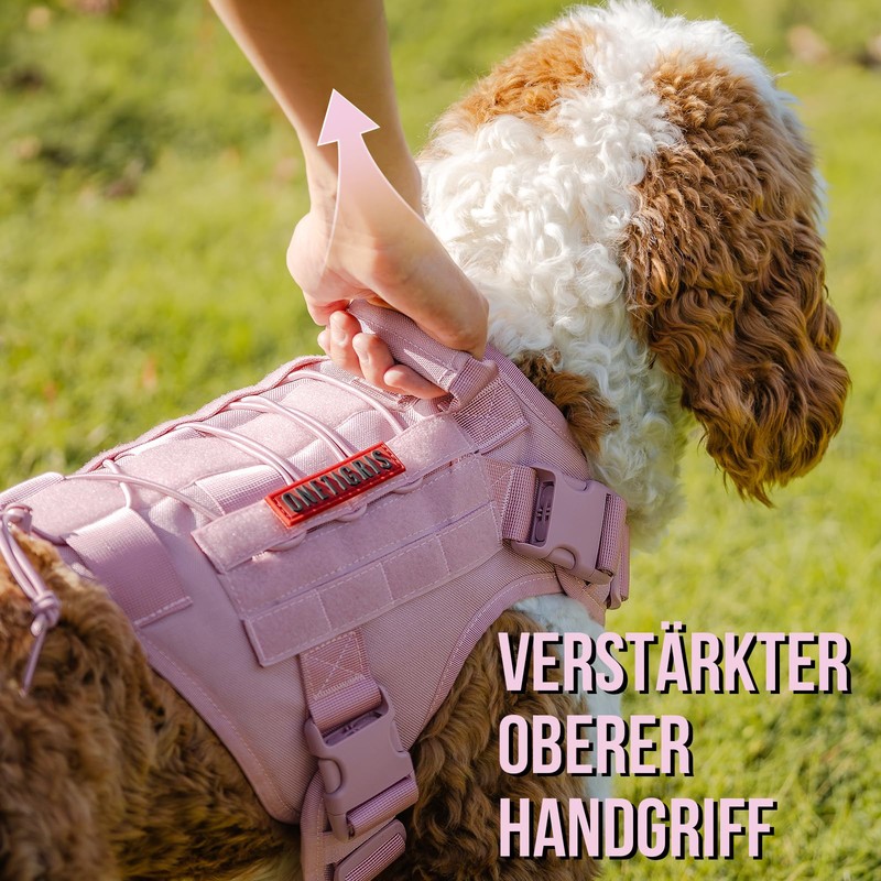 - Onetigris military style dog harness: The large Onetigris dog harness has two straps on each side as well as a hook and loop panel for easy attachment of bags or ID panels; the dog harness is not designed to carry heavy weights, and we advise against relying exclusively on the handle to carry your dog